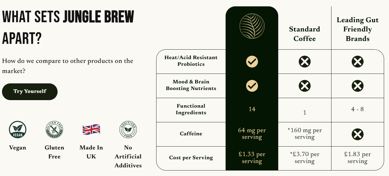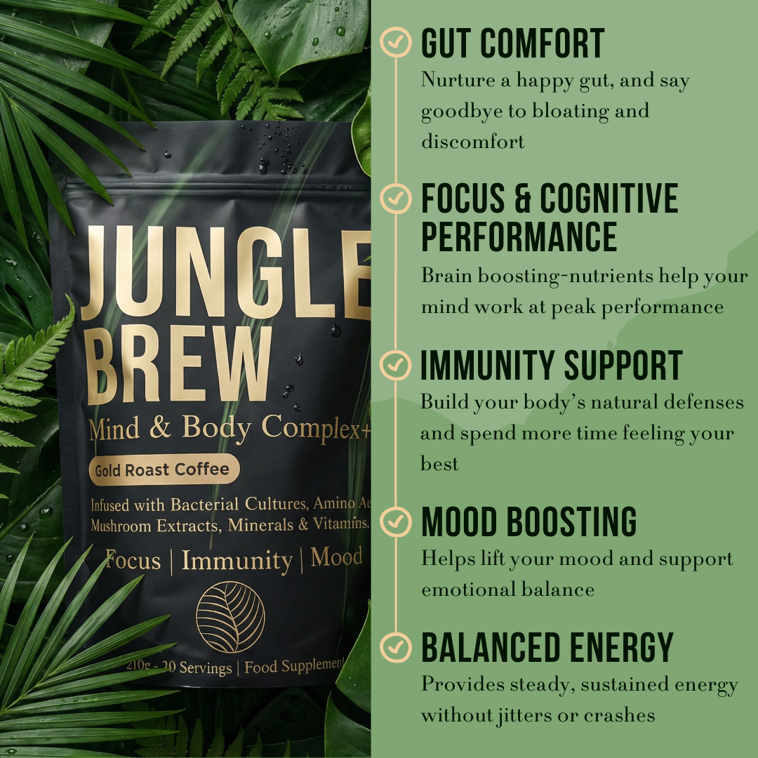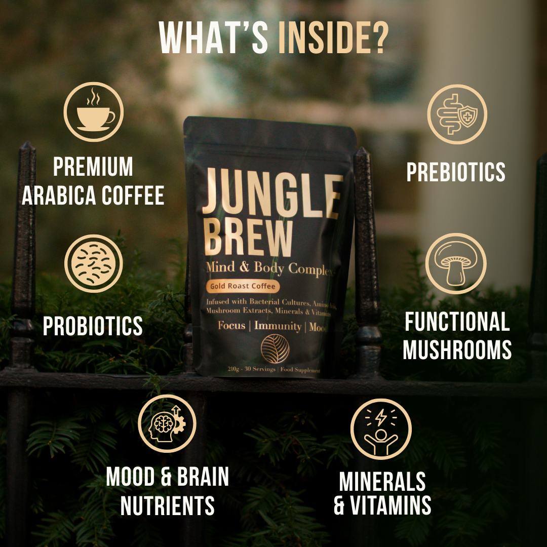 Unlike standard coffee, Jungle Brew is formulated to support your gut, mind and overall wellbeing, while still delivering the familiar taste and lift of coffee - with added benefits from prebiotics, probiotics, functional mushrooms, amino acids, minerals and vitamins.