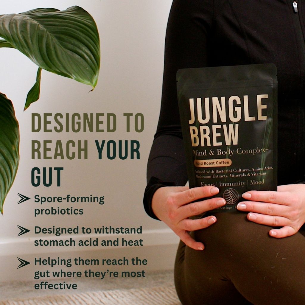 Jungle Brew uses two targeted probiotic strains (Bacillus coagulans & Bacillus subtilis) that are designed to survive heat and stomach acid, meaning they’re more likely to reach your gut alive. Unlike many probiotics that can be weakened by hot drinks, these strains are stable in coffee and work alongside the prebiotic fibre to support gut balance, digestion, and daily comfort.