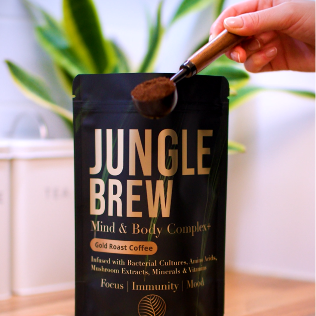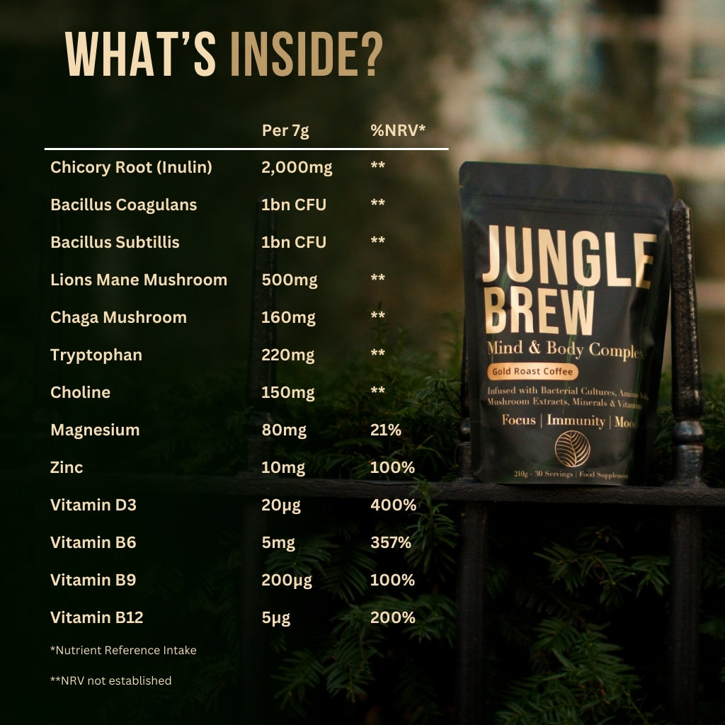 Jungle Brew contains Arabica coffee, probiotics (Bacillus coagulans & Bacillus subtilis), prebiotic chicory root, Lion’s Mane, Chaga, tryptophan, choline, magnesium, zinc, vitamin D3, B6, B9 and B12.